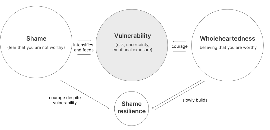 Vulnerability củng cố shame vì khi chúng ta dám để cho người khác “nhìn thấy” mình, ta đối diện với những rủi ro và sự phơi bày về mặt cảm xúc, bao gồm rủi ro bị người khác đánh giá hoặc khước từ, khiến ta càng cảm thấy hổ thẹn.